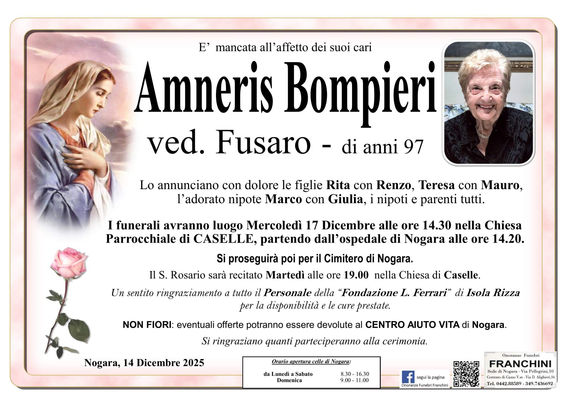 Amneris Bompieri di anni 97 Informazioni esequie LUOGO DEI FUNERALI: Chiesa Parrocchiale di Caselle IL GIORNO: Mercoledì 17 Dicembre ALLE ORE: 14:30 Scrivi il tuo messaggio di cordoglio alla famiglia Lascia un messaggio di cordoglio, sarà nostra cura consegnarlo ai congiunti. Nome del defunto (obbligatorio) Nome della vostra famiglia (obbligatorio) Email (obbligatorio) Telefono (opzionale) Il tuo messaggio (obbligatorio) Ho letto l'informativa sulla privacy policy e autorizzo al trattamento dei dati personali ai sensi del D.L. n. 196/2003 art.13. Δ