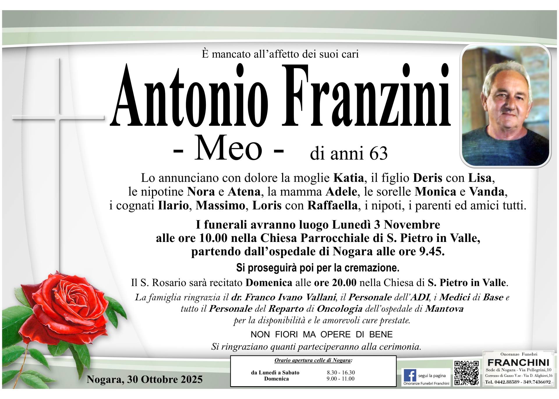 Antonio Franzini di anni 63 Informazioni esequie LUOGO DEI FUNERALI: Chiesa Parrocchiale di S.Pietro in Valle IL GIORNO: Lunedì 3 Novembre ALLE ORE: 10:00 Scrivi il tuo messaggio di cordoglio alla famiglia Lascia un messaggio di cordoglio, sarà nostra cura consegnarlo ai congiunti. Errore: Modulo di contatto non trovato.