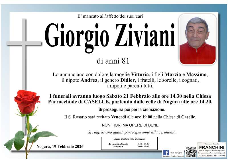 Giorgio Ziviani di anni 81 Informazioni esequie LUOGO DEI FUNERALI: Chiesa Parrocchiale di Caselle IL GIORNO: Sabato 21 Febbraio ALLE ORE: 14:30 Scrivi il tuo messaggio di cordoglio alla famiglia Lascia un messaggio di cordoglio, sarà nostra cura consegnarlo ai congiunti. Nome del defunto (obbligatorio) Nome della vostra famiglia (obbligatorio) Email (obbligatorio) Telefono (opzionale) Il tuo messaggio (obbligatorio) Ho letto l'informativa sulla privacy policy e autorizzo al trattamento dei dati personali ai sensi del D.L. n. 196/2003 art.13. Δ