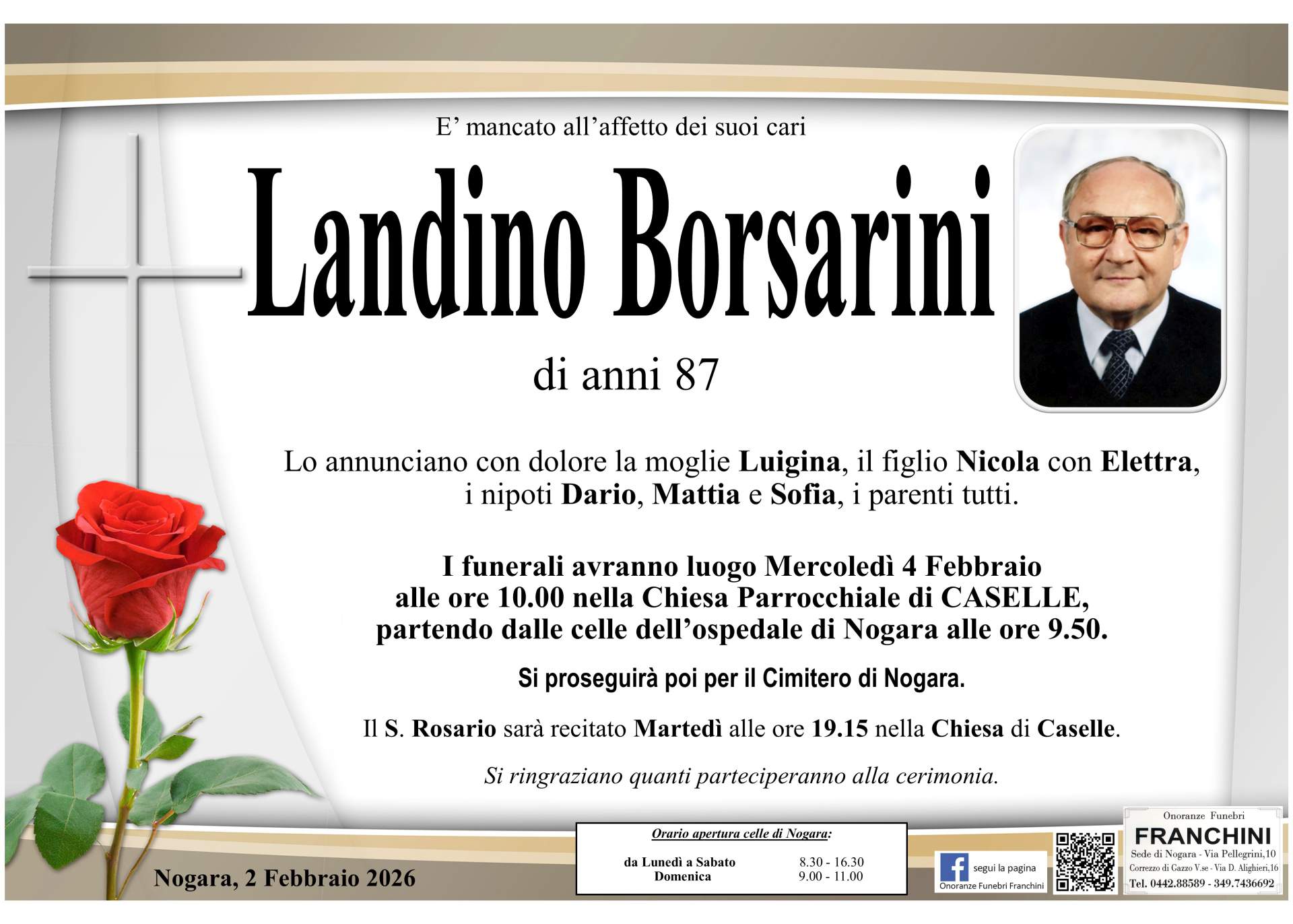 Landino Borsarini di anni 87 Informazioni esequie LUOGO DEI FUNERALI: Chiesa Parrocchiale di Caselle IL GIORNO: Mercoledì 4 Febbraio ALLE ORE: 10:00 Scrivi il tuo messaggio di cordoglio alla famiglia Lascia un messaggio di cordoglio, sarà nostra cura consegnarlo ai congiunti. Nome del defunto (obbligatorio) Nome della vostra famiglia (obbligatorio) Email (obbligatorio) Telefono (opzionale) Il tuo messaggio (obbligatorio) Ho letto l'informativa sulla privacy policy e autorizzo al trattamento dei dati personali ai sensi del D.L. n. 196/2003 art.13. Δ