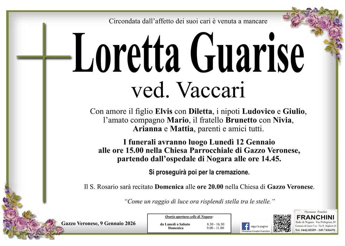 Loretta Guarise Informazioni esequie LUOGO DEI FUNERALI: Chiesa Parrocchiale di Gazzo Veronese IL GIORNO: Lunedi 15 Gennaio ALLE ORE: 15:00 Scrivi il tuo messaggio di cordoglio alla famiglia Lascia un messaggio di cordoglio, sarà nostra cura consegnarlo ai congiunti. Nome del defunto (obbligatorio) Nome della vostra famiglia (obbligatorio) Email (obbligatorio) Telefono (opzionale) Il tuo messaggio (obbligatorio) Ho letto l'informativa sulla privacy policy e autorizzo al trattamento dei dati personali ai sensi del D.L. n. 196/2003 art.13. Δ